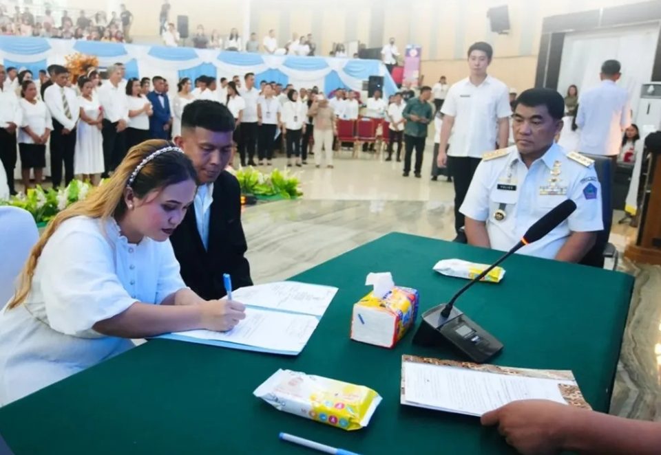 MANADO — Sebanyak 124 pasangan calon pengantin dari berbagai kabupaten dan kota di Sulawesi Utara (Sulut) resmi tercatat dalam kegiatan pencatatan perkawinan massal yang digelar di Aula Mapalus, Kantor Gubernur Sulut, Kota Manado, Rabu (30/4/2025).
